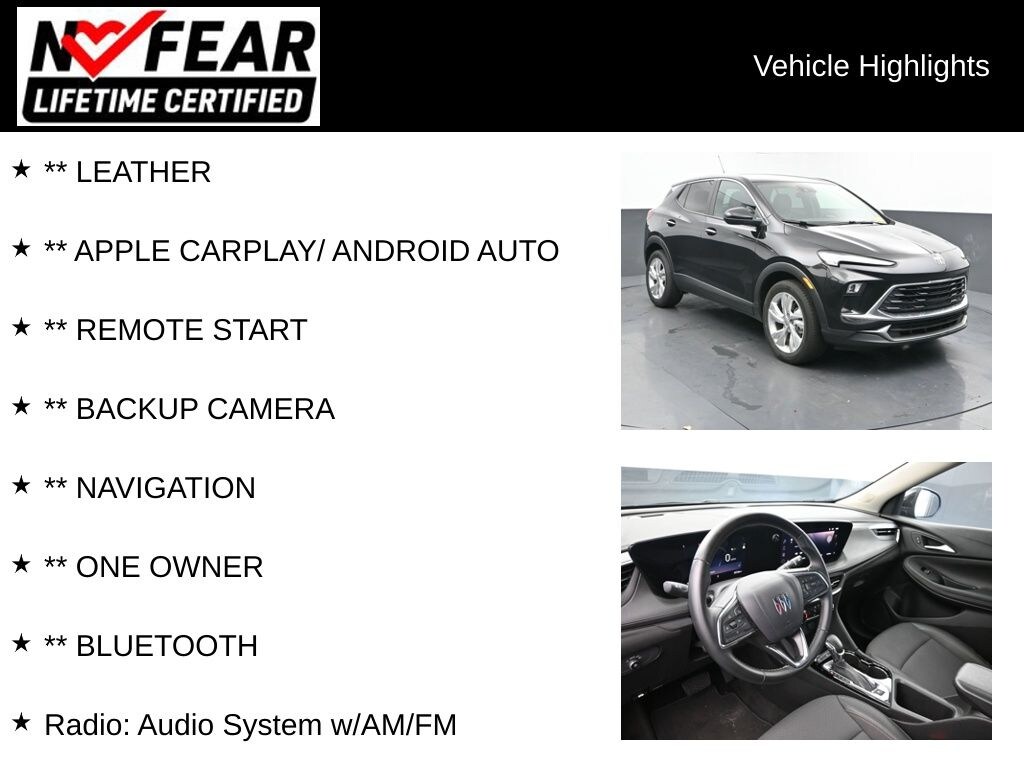 ** LEATHER, ** APPLE CARPLAY/ ANDROID AUTO, ** REMOTE START, ** BACKUP CAMERA, ** NAVIGATION, ** ONE OWNER, ** BLUETOOTH, 2 USB Ports (1 Type-A, 1 Type-C), 4-Way Manual Passenger Seat Adjuster, 6 Speakers, 6-Way Manual Driver Seat Adjuster, Automatic temperature control, Delay-off headlights, Emergency communication system: OnStar and Buick connected services capable, Enhanced Performance 6-Speaker System, Front anti-roll bar, Front reading lights, Front wheel independent suspension, Outside temperature display, Overhead console, Panic alarm, Radio data system, Radio: Audio System w/AM/FM, Rear reading lights, Rear window wiper, Ride & Handling Suspension, Speed-sensing steering, Spoiler, Tachometer, Trip computer, Wireless Apple CarPlay/Wireless Android Auto.