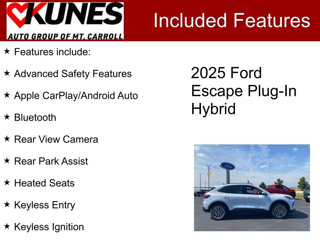 The 2025 Escape Plug-In Hybrid can carry all the passengers and cargo you need in style and comfort. Also included with every new vehicle: LIFETIME "NO FEAR" WARRANTY and AT HOME COURTESY DELIVERY! Call us for full details! We pride ourselves on honesty and integrity, but please note that mistakes or misprints due to human error are possible. Find out why our dealerships have won DealerRater.com DEALER OF THE YEAR a whopping 10 TIMES! Call, email, or live chat with one of our friendly sales professionals now to schedule your test drive! Prices shown do not include taxes, license, and title fees and a $367.70 documentary service fee. Customer must qualify for advertised rebates. Not responsible for human error. Price includes: $750 - 2026 College Student Recognition Exclusive Cash Reward Pgm. Exp. 01/04/2027 $8000 - Model Year Closeout Bonus Cash - Escape PHEV. Exp. 04/30/2026