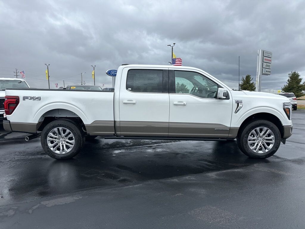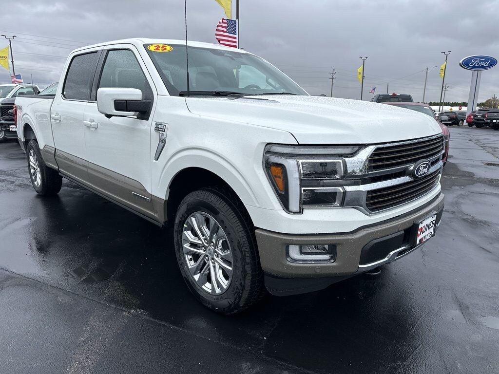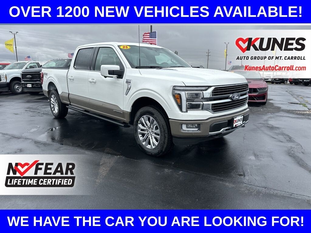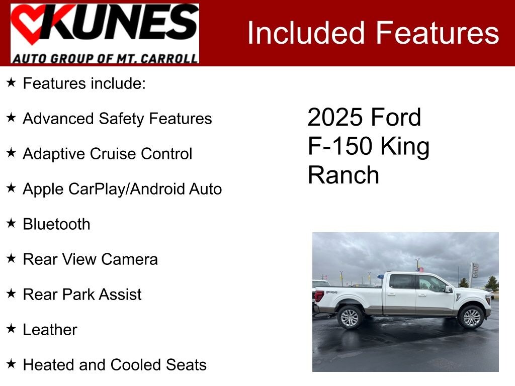 Features include:, Advanced Safety Features, Adaptive Cruise Control, Apple CarPlay/Android Auto, Bluetooth, Rear View Camera, Rear Park Assist, Leather, Heated and Cooled Seats, Keyless Entry, Keyless Ignition, Remote Start, Navigation/GPS/NAVI, Sirius/XM, Sunroof/Moonroof, Running Boards, Bed Liner, Tow Package, Steering Wheel Controls, F-150 King Ranch, 4D SuperCrew, 3.5L PowerBoost Full-Hybrid V6, 10-Speed Automatic, 4WD, Star White Metallic Tri-Coat, Kr Bucket Seats Leather, Equipment Group 601A High, FX4 Off-Road Package, Navigation system: Connected Navigation, 14 Speakers, 4-Wheel Disc Brakes, 4x4 FX4 Off-Road Bodyside Decal, ABS brakes, Adjustable pedals, Air Conditioning, Alloy wheels, AM/FM radio: SiriusXM with 360L, Auto High-beam Headlights, Auto tilt-away steering wheel, Auto-dimming door mirrors, Auto-dimming Rear-View mirror, Automatic temperature control, Brake assist, Chrome wheels, Compass, Delay-off headlights, Driver door bin, Driver vanity mirror, Dual front impact airbags, Dual front side impact airbags, Electronic Locking w/3.55 Axle Ratio, Electronic Stability Control, Emergency communication system: SYNC 4 911 Assist, Front anti-roll bar, Front Bucket Seats, Front Center Armrest, Front dual zone A/C, Front fog lights, Front License Plate Bracket, Front reading lights, Front wheel independent suspension, Fully automatic headlights, Garage door transmitter, Genuine wood dashboard insert, Heads-Up Display, Heated door mirrors, Heated front seats, Heated rear seats, Heated steering wheel, Hill Descent Control, Illuminated entry, King Ranch Multicontour Leather Bucket Seats, Leather steering wheel, Low tire pressure warning, Memory seat, Monotube Rear Shocks, Occupant sensing airbag, Off-Road Tuned Front Shock Absorbers, Outside temperature display, Overhead airbag, Overhead console, Panic alarm, Passenger door bin, Passenger vanity mirror, Pedal memory, Power door mirrors, Power driver seat, Power moonroof, Power passenger seat, Power steering, Power windows, Radio data system, Radio: B&O Unleashed Sound System by Bang & Olufsen, Rain sensing wipers, Rear reading lights, Rear seat center armrest, Rear step bumper, Rear window defroster, Remote keyless entry, Rock Crawl Mode, Security system, Speed control, Split folding rear seat, Steering wheel memory, Steering wheel mounted audio controls, SYNC 4 w/Enhanced Voice Recognition, Tachometer, Telescoping steering wheel, Tilt steering wheel, Tough Bed Spray-In Bedliner, Traction control, Trip computer, Turn signal indicator mirrors, Variably intermittent wipers, Ventilated front seats, Voltmeter, Wheels: 20" Chrome-Like PVD, F-150 King Ranch, 4D SuperCrew, 3.5L PowerBoost Full-Hybrid V6, 10-Speed Automatic, 4WD, Star White Metallic Tri-Coat, Kr Bucket Seats Leather, Equipment Group 601A High, FX4 Off-Road Package, Navigation system: Connected Navigation. 2025 Ford F-150 King Ranch Star White Metallic Tri-Coat 3.5L PowerBoost Full-Hybrid V6 The 2025 F-150 can handle any task at work or play. Also included with every new vehicle: LIFETIME "NO FEAR" WARRANTY and AT HOME COURTESY DELIVERY! Call us for full details! We pride ourselves on honesty and integrity, but please note that mistakes or misprints due to human error are possible. Find out why our dealerships have won DealerRater.com DEALER OF THE YEAR a whopping 10 TIMES! Call, email, or live chat with one of our friendly sales professionals now to schedule your test drive! Prices shown do not include taxes, license, and title fees and a $367.70 documentary service fee.