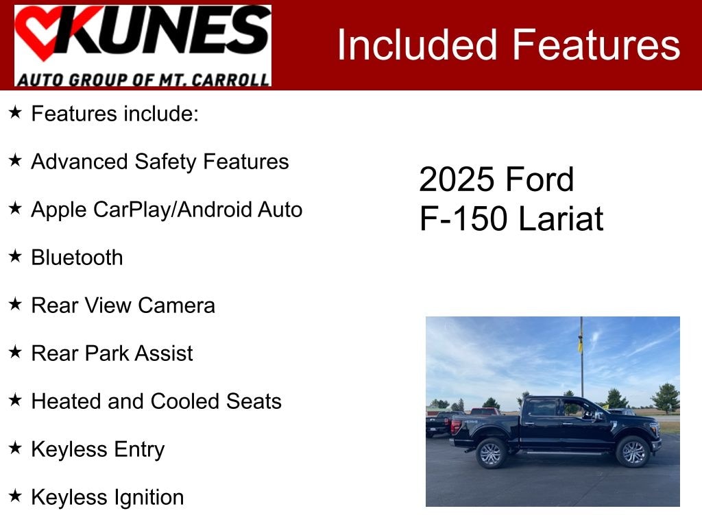 Advanced Safety Features, Apple CarPlay/Android Auto, Bluetooth, Rear View Camera, Rear Park Assist, Heated and Cooled Seats, Keyless Entry, Keyless Ignition, Remote Start, Navigation/GPS/NAVI, Sirius/XM, Tow Package, F-150 Lariat, 4D SuperCrew, 5.0L V8, 10-Speed Automatic, 4WD, Agate Black Metallic, Black Active X Leatherette, Equipment Group 501A Mid, Navigation system: Connected Navigation, Tow/Haul Package, 3.31 Axle Ratio, 4-Wheel Disc Brakes, 6" Angular Bright Anodized Step Bar, 8 Speakers, ABS brakes, ActiveX Trimmed Bucket Seats, Adjustable pedals, Air Conditioning, Alloy wheels, AM/FM radio: SiriusXM with 360L, Auto High-beam Headlights, Auto-dimming door mirrors, Auto-dimming Rear-View mirror, Automatic temperature control, BlueCruise Equipped (1-Year Plan), Brake assist, Bumpers: chrome, Chrome wheels, Compass, Delay-off headlights, Driver door bin, Driver vanity mirror, Dual front impact airbags, Dual front side impact airbags, Electronic Stability Control, Emergency communication system: SYNC 4 911 Assist, Front anti-roll bar, Front Bucket Seats, Front Center Armrest, Front dual zone A/C, Front fog lights, Front License Plate Bracket, Front reading lights, Front wheel independent suspension, Fully automatic headlights, Garage door transmitter, Heated door mirrors, Heated front seats, Heated steering wheel, Illuminated Driver & Passenger Visors, Illuminated entry, Low tire pressure warning, Memory seat, Occupant sensing airbag, Outside temperature display, Overhead airbag, Overhead console, Panic alarm, Passenger door bin, Passenger vanity mirror, Pedal memory, Power door mirrors, Power driver seat, Power passenger seat, Power steering, Power windows, Power-Sliding Rear Window, Radio data system, Radio: B&O Sound System by Bang & Olufsen, Rain sensing wipers, Rear reading lights, Rear seat center armrest, Rear step bumper, Rear window defroster, Remote keyless entry, Security system, Speed control, Split folding rear seat, Steering wheel mounted audio controls, SYNC 4 w/Enhanced Voice Recognition, Tachometer, Telescoping steering wheel, Tilt steering wheel, Tough Bed Spray-In Bedliner, Traction control, Trip computer, Turn signal indicator mirrors, Variably intermittent wipers, Ventilated front seats, Voltmeter, Wheels: 18" Chrome-Like PVD, Wheels: 20" Chrome-Like PVD, F-150 Lariat, 4D SuperCrew, 5.0L V8, 10-Speed Automatic, 4WD, Agate Black Metallic, Black Active X Leatherette, Equipment Group 501A Mid, Navigation system: Connected Navigation, Tow/Haul Package. 2025 Ford F-150 Lariat Agate Black Metallic 5.0L V8