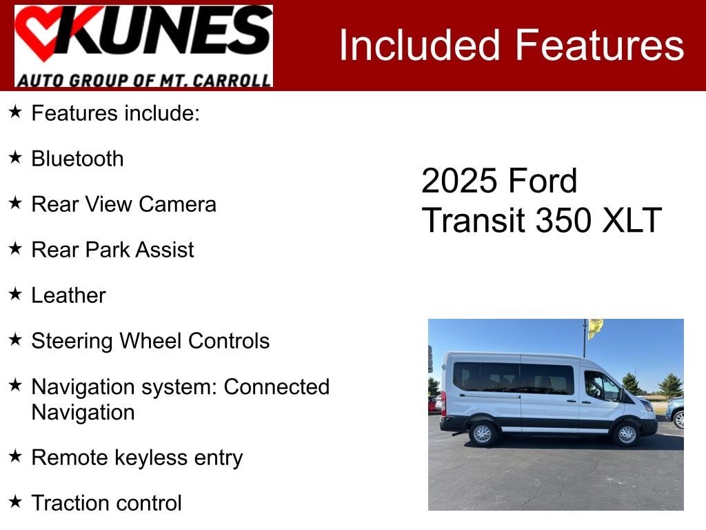 Pricing includes $2000 Trade In Assistance, and incentive to finance with Dealership. Must trade in 10 year or newer vehicle with less than 100,000 miles. Features include:, Bluetooth, Rear View Camera, Rear Park Assist, Leather, Steering Wheel Controls, Transit-350 XLT, Passenger Van, 3.5L V6 Flex Fuel, 10-Speed Automatic with Overdrive, AWD, Oxford White, Gray Cloth, ABS brakes, Electronic Stability Control, Heated door mirrors, Illuminated entry, Low tire pressure warning, Navigation system: Connected Navigation, Remote keyless entry, Traction control, 3rd row seats: split-bench, 4-Wheel Disc Brakes, 4th-Row Bench Seat, 8 Speakers, Air Conditioning, AM/FM RADIO, Auto High-beam Headlights, Automatic temperature control, Brake assist, Bumpers: body-color, Cloth Front Bucket Seats, Dark Palazzo Gray Cloth Bucket Seats, Delay-off headlights, Driver door bin, Driver vanity mirror, Driver's Seat Mounted Armrest, Dual front impact airbags, Dual front side impact airbags, Electronic Air Temperature Control, Emergency communication system: 911 Assist, Front anti-roll bar, Front Bucket Seats, Front Fog Lamps, Front fog lights, Front reading lights, Front Sensing System, Front wheel independent suspension, Fully automatic headlights, Large Center Console, Occupant sensing airbag, Overhead airbag, Panic alarm, Passenger door bin, Passenger seat mounted armrest, Passenger vanity mirror, Power door mirrors, Power steering, Power windows, Radio: AM/FM Stereo w/SYNC 4 & Nav, Rain sensing wipers, Rear air conditioning, Rear reading lights, Rear window defroster, Reverse Sensing System, Side Sensing System, Speed control, Steering wheel mounted audio controls, Tachometer, Telescoping steering wheel, Tilt steering wheel, Trip computer, Turn signal indicator mirrors, Variably intermittent wipers, Wheels: 16" Silver Steel w/Exposed Lug Nuts, Transit-350 XLT, Passenger Van, 3.5L V6 Flex Fuel, 10-Speed Automatic with Overdrive, AWD, Oxford White, Gray Cloth, ABS brakes, Electronic Stability Control, Heated door mirrors, Illuminated entry, Low tire pressure warning, Navigation system: Connected Navigation, Remote keyless entry, Traction control. 2025 Ford Transit-350 XLT Oxford White 3.5L V6 Flex Fuel The 2025 Transit-350 gives you all the passenger and storage space you need along with the economy you need. Also included with every new vehicle: LIFETIME "NO FEAR" WARRANTY and AT HOME COURTESY DELIVERY! Call us for full details! We pride ourselves on honesty and integrity, but please note that mistakes or misprints due to human error are possible. Find out why our dealerships have won DealerRater.com DEALER OF THE YEAR a whopping 10 TIMES! Call, email, or live chat with one of our friendly sales professionals now to schedule your test drive! Prices shown do not include taxes, license, and title fees and a $367.70 documentary service fee.