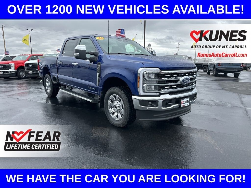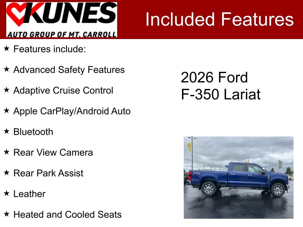 Features include:, Advanced Safety Features, Adaptive Cruise Control, Apple CarPlay/Android Auto, Bluetooth, Rear View Camera, Rear Park Assist, Leather, Heated and Cooled Seats, Keyless Entry, Keyless Ignition, Remote Start, Navigation/GPS/NAVI, Sirius/XM, Running Boards, Bed Liner, Tow Package, Steering Wheel Controls, F-350 SuperDuty Lariat, 4D Crew Cab, Power Stroke 6.7L V8 DI 32V OHV Turbodiesel, 10-Speed Automatic, 4WD, Argon Blue Metallic, Black Onyx, 5th Wheel/Gooseneck Hitch Prep Package, Chrome Package, Ford Connectivity Package (1-Year Included), FX4 Off-Road Package, Internet access capable: 5G Modem - Ford Connectivity Package, Lariat Premium Package, Navigation system: Connected Navigation. 2026 Ford F-350SD Lariat Argon Blue Metallic Power Stroke 6.7L V8 DI 32V OHV Turbodiesel The 2026 F-350SD can handle any task at work or play. Also included with every new vehicle: LIFETIME "NO FEAR" WARRANTY and AT HOME COURTESY DELIVERY! Call us for full details! We pride ourselves on honesty and integrity, but please note that mistakes or misprints due to human error are possible. Find out why our dealerships have won DealerRater.com DEALER OF THE YEAR a whopping 10 TIMES! Call, email, or live chat with one of our friendly sales professionals now to schedule your test drive! Prices shown do not include taxes, license, and title fees and a $367.70 documentary service fee.