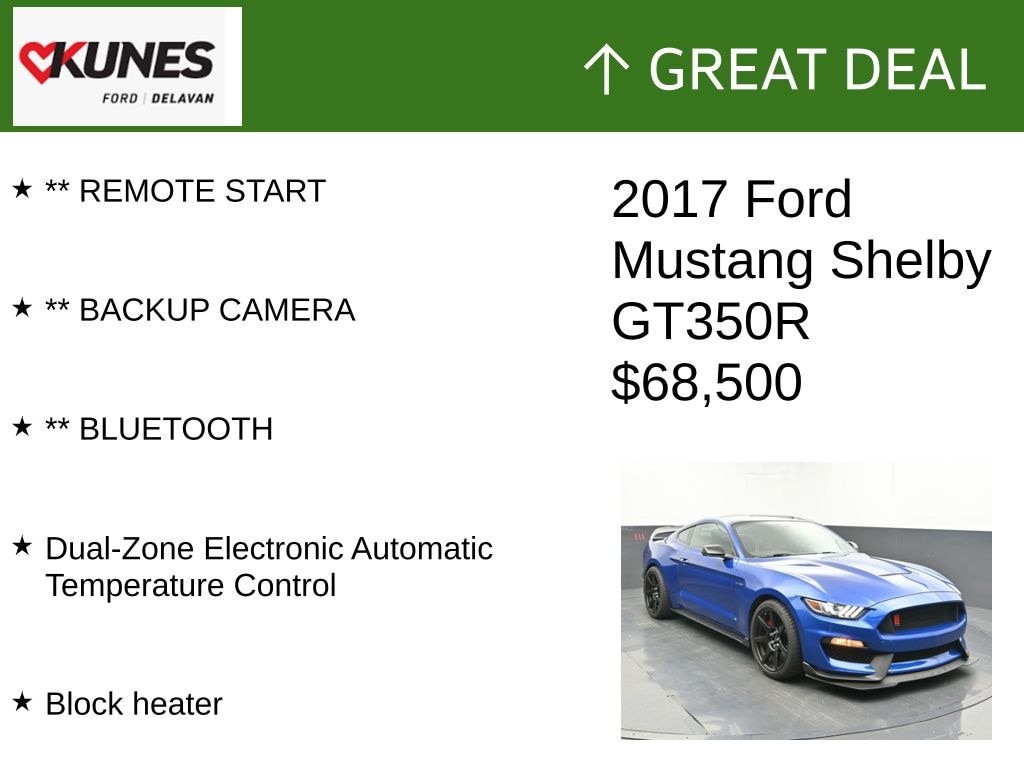⢠2017 Shelby GT350R with 5.2L Ti-VCT V8 engine and 6-speed manual transmission